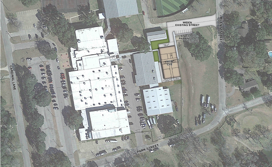 Construction of the new CTE center is expected to take place without impacting school operations. Classes will be in session in the current structure(s) while construction is underway on the east end of the property.
