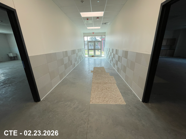At the Elementary School, interior renovation drawings continued to be developed in coordination with the engineering team. Exterior sidewalk and grading work was planned to take place over the next couple of weeks, which required canopy installation to pause until those items were completed. Interior finish work, including paint and tile installation, remained ongoing.